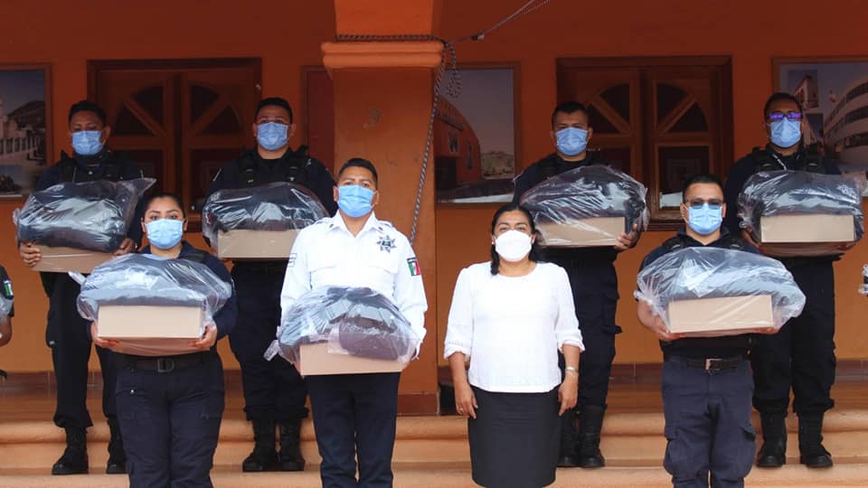 Tecomatlán, Puebla. La alcaldesa antorchista Sara Yolanda Reyes Hernández, en compañía del director de Seguridad Pública, César Antonio Reyes Pérez, realizaron la entrega de uniformes y equipamiento a elementos de Seguridad Pública.