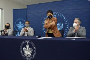 En compañía de Nadia Ekatherina Huerta Jiménez, directora de Acompañamiento Universitario, la doctora Cedillo externó su agradecimiento a los empresarios: “Nuestra institución reconoce la labor que hacen, sobre todo porque emplean a nuestros egresados. Ahora, con este programa, les dan la oportunidad de terminar sus estudios. Por eso, les agradecemos que hayan abierto su corazón para ayudar a estos jóvenes”.