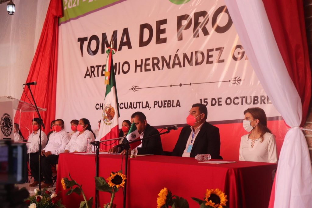Chiconcuautla, Puebla. El cuerpo de regidores, síndico y presidente, toman protesta como servidores público de la administración municipal 2021-2024, siendo el C. Artemio Hernández Garrido, quien tomara protesta a quienes participarán como Tesorera, Secretario y Contralor de este H. Ayuntamiento.